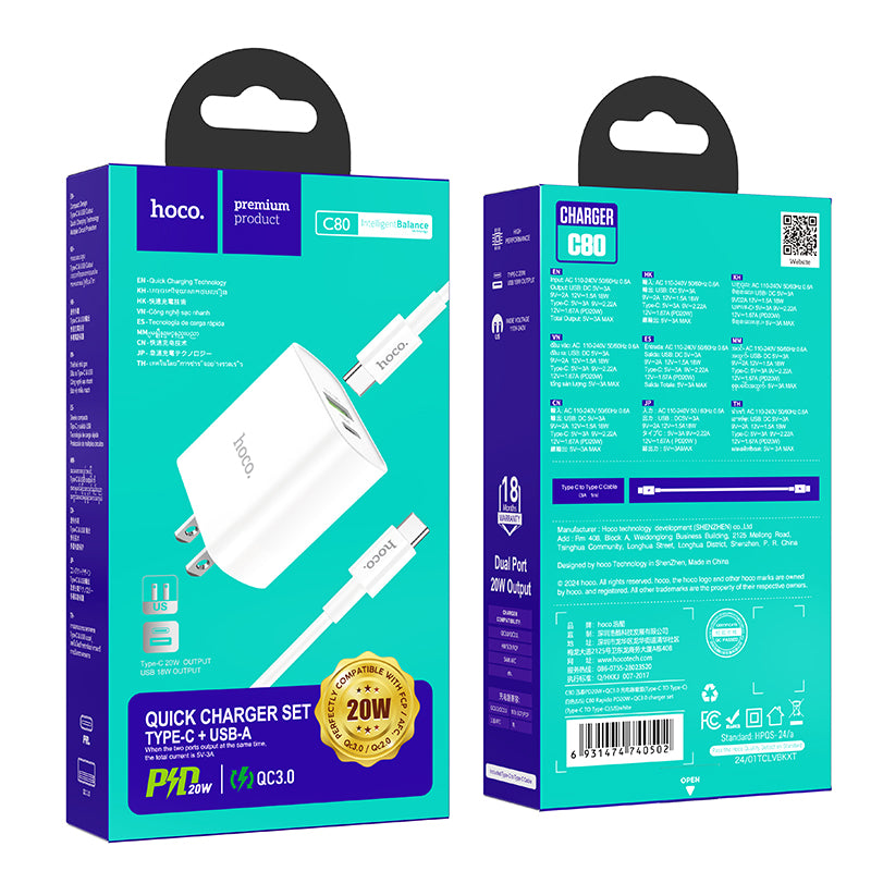 HOCO C80 PD20W+QC3.0 charger C To C Cable Combo